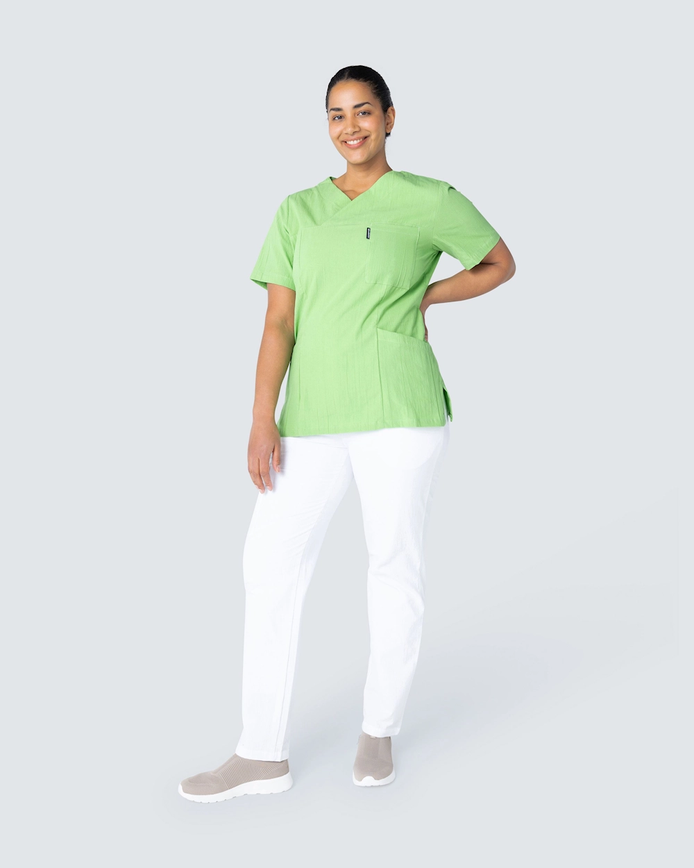 Busseronne i crinkled bomuld, der giver en let og luftig fornemmelse. Den crinklede bomuld er let at holde og kræver minimal pleje, såsom strygning. Busseronnen har v-udskæring og er i en lidt indsnævret model, som giver en flot silhuet og pasform. Med både en brystlomme og to hoftelommer med en mobillomme og en nøglerem har du masser af plads til forskellige arbejdsredskaber og genstande, du har brug for i løbet af en arbejdsdag.