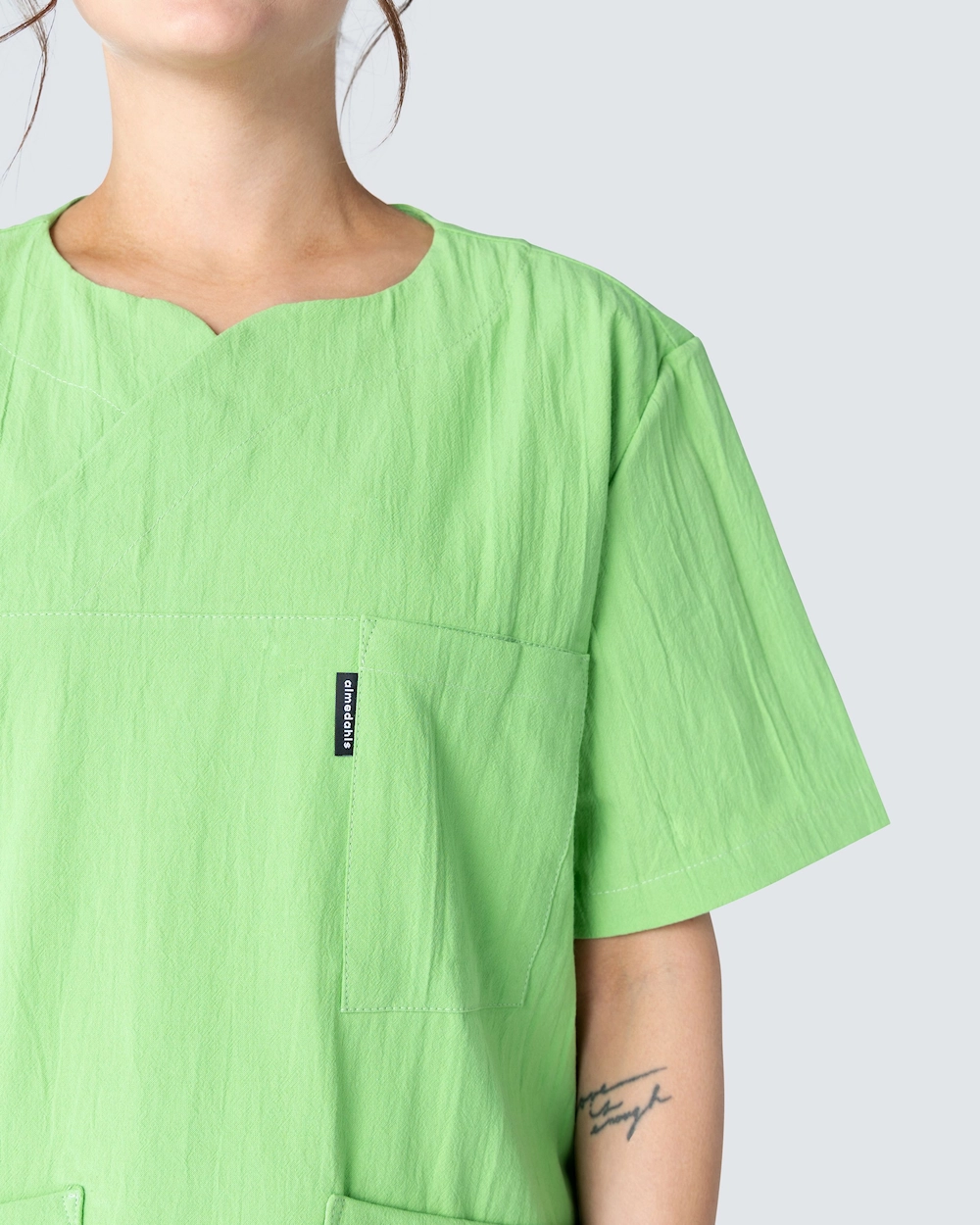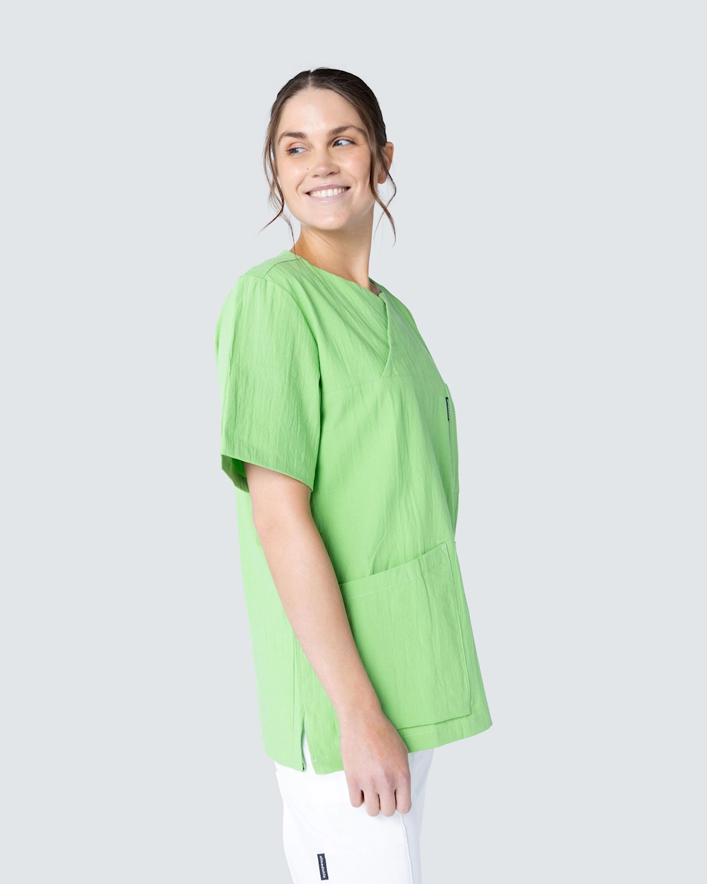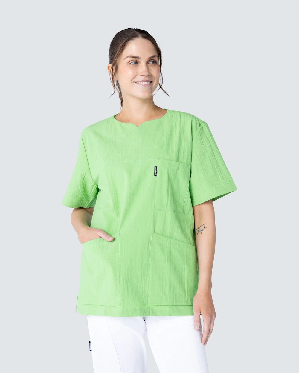 Busseronnen er i en lige unisex model med praktiske og rummelige lommer, der har masser af plads til arbejdsredskaber. Hoftelommerne har en mobillomme og nøglerem, hvor du nemt kan vedhæfte nøgler eller ID-kort. Busseronnen har en rund v-udskæring, som giver en flot detalje. Med slids i siden får du masser af bevægelsesfrihed. Busseronnen er lavet af crinkled bomuld, hvilket giver en luftig og behagelig fornemmelse. Det crinkled stof reducerer også behovet for pleje, såsom strygning.