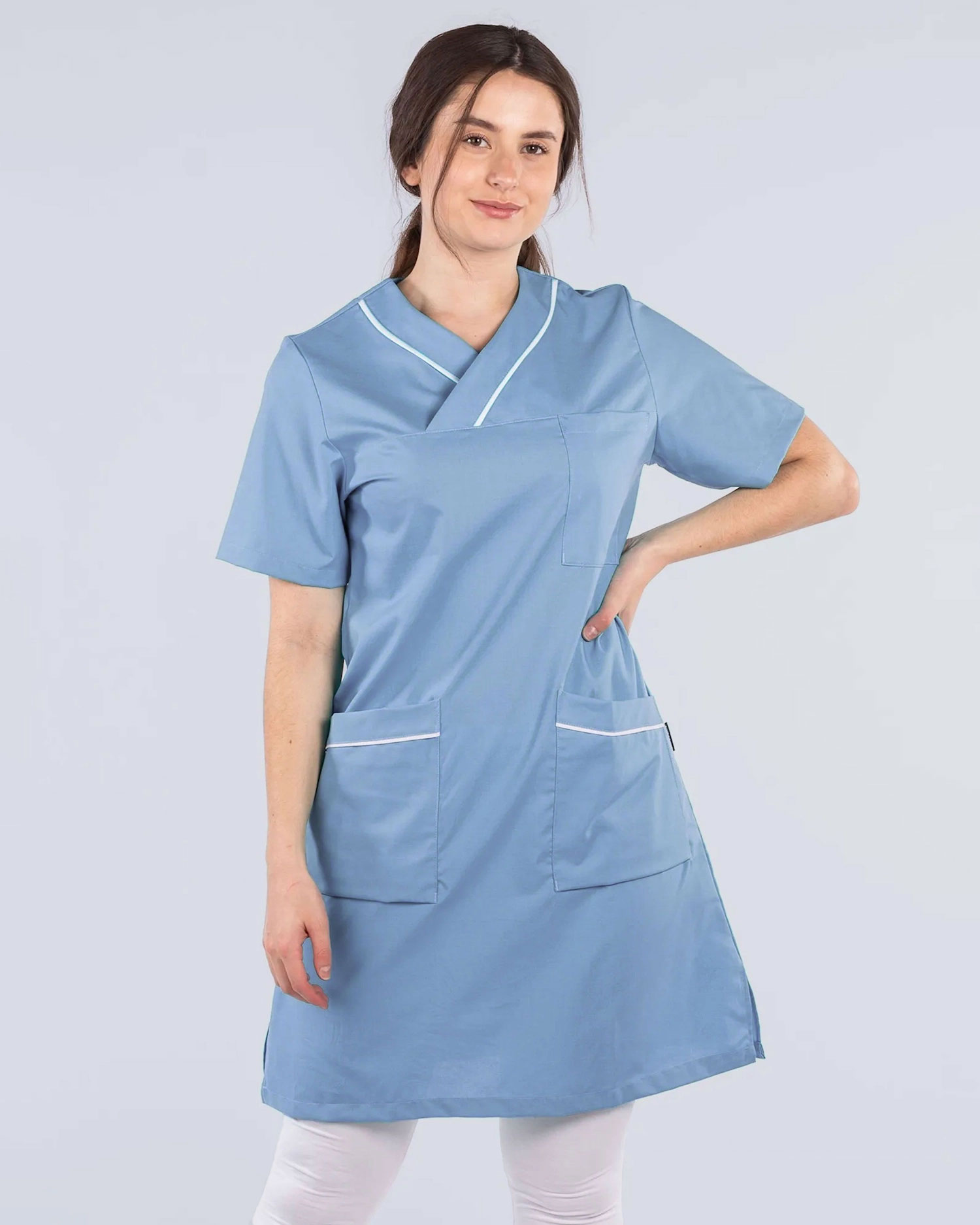 Arbejdskjole med fine detaljer med passepoil i halsen og lommer. Kjolen har en brystlomme og to rummelige hoftelommer. Med slids i siden får du en behagelig kjole med god bevægelsesfrihed.