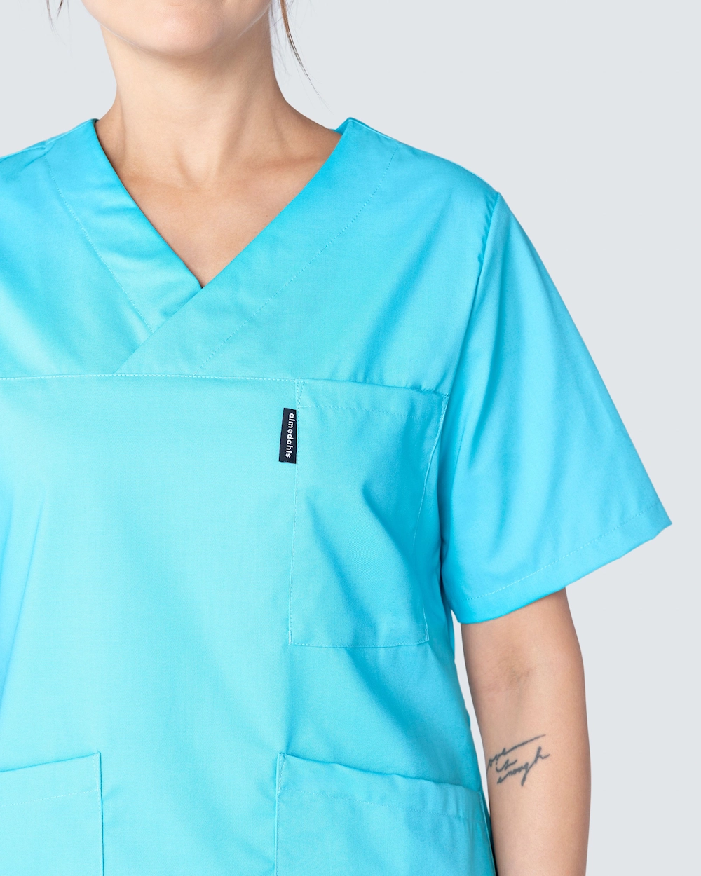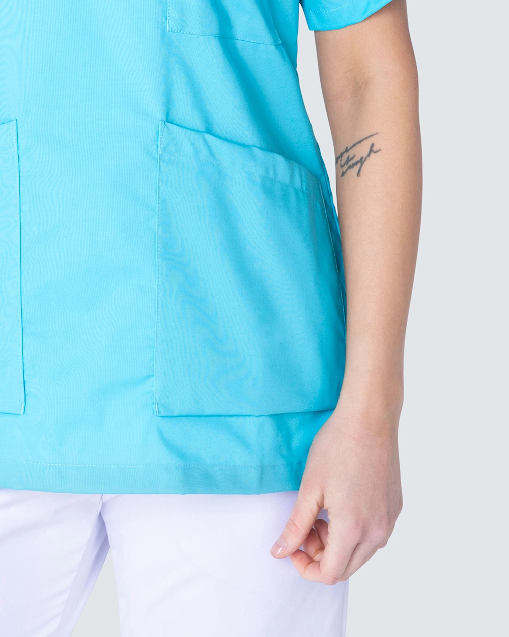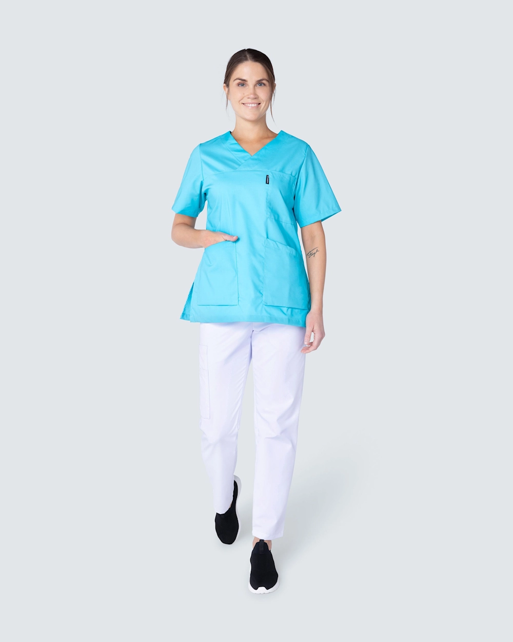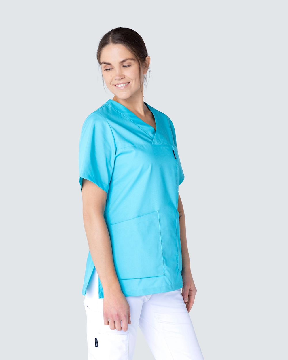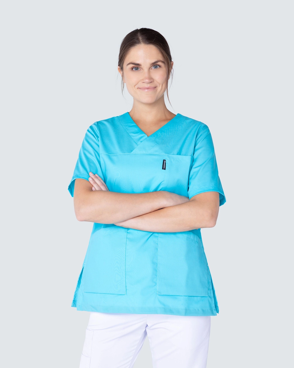 Feminin arbejdsbluse i let indsnævret model og dekorativ v-udskæring. Blusen har en brystlomme og to rummelige hoftelommer med en ekstra mobillomme og nøglerem på indersiden. Slidser i siderne giver god bevægelsesfrihed.