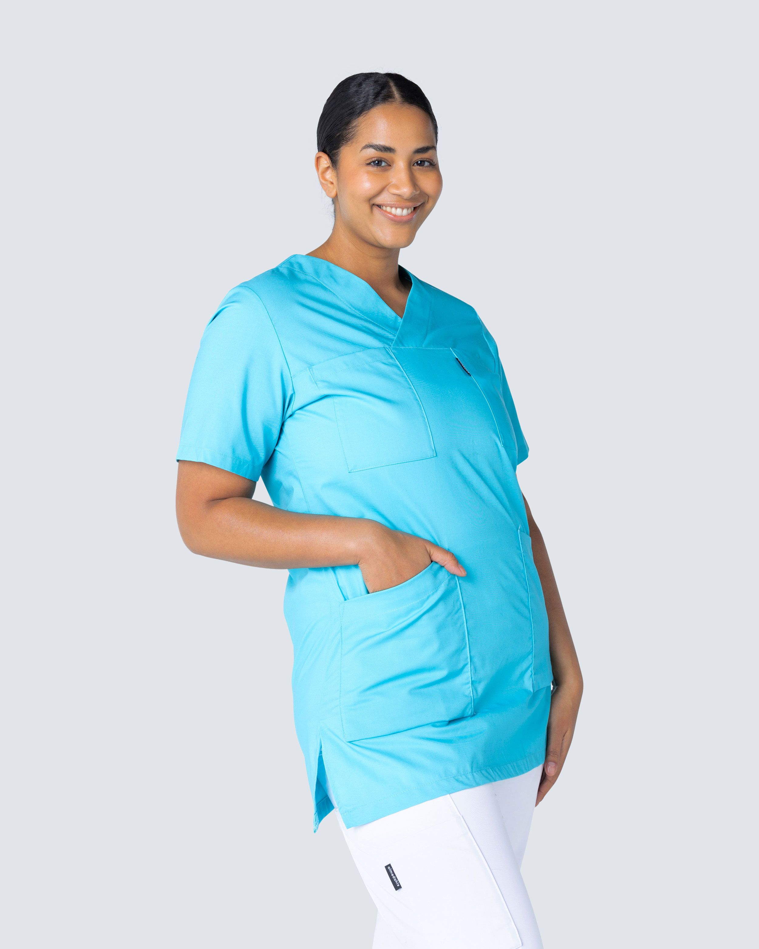 Feminin dametunika i let indsnævret model og flot v-udskæring. Tunikaen er lavet i en blanding af bomuld/polyester, hvilket giver en luftig og behagelig fornemmelse. To brystlommer og to hoftelommer giver masser af plads til arbejdsredskaber. Hoftelommerne har en ekstra mobillomme og en nøglerem. Tunikaen har slids i siderne, hvilket giver bedre bevægelsesfrihed.