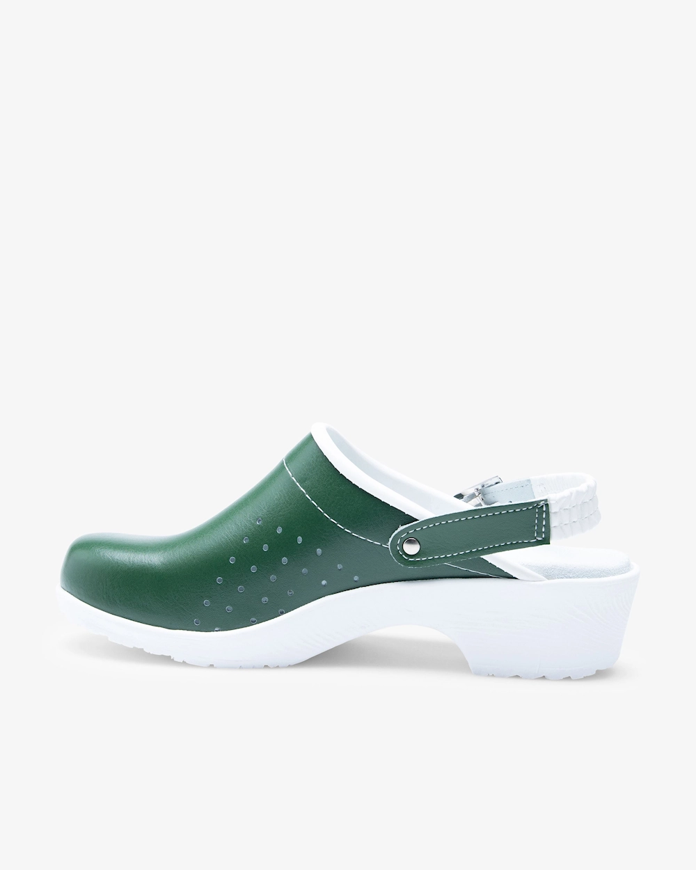 Komfort i fokus, uanset farve Uanset farvevalg er kernen i denne sko dens ergonomiske fordele. Overdelen i blødt, ægte læder giver øjeblikkelig komfort og tilpasser sig foden. Den er belagt med et beskyttende og letplejet PU-lag, hvilket er essentielt for at opretholde hygiejne og forlænge skoens levetid. Den specialudviklede sål i polyuretan er skoens hjerte; den giver den stødabsorbering, der kræves for at beskytte kroppen mod belastningen fra hårde gulve. Den roterbare hælrem fuldender designet ved at tilbyde tilpasselig sikkerhed.