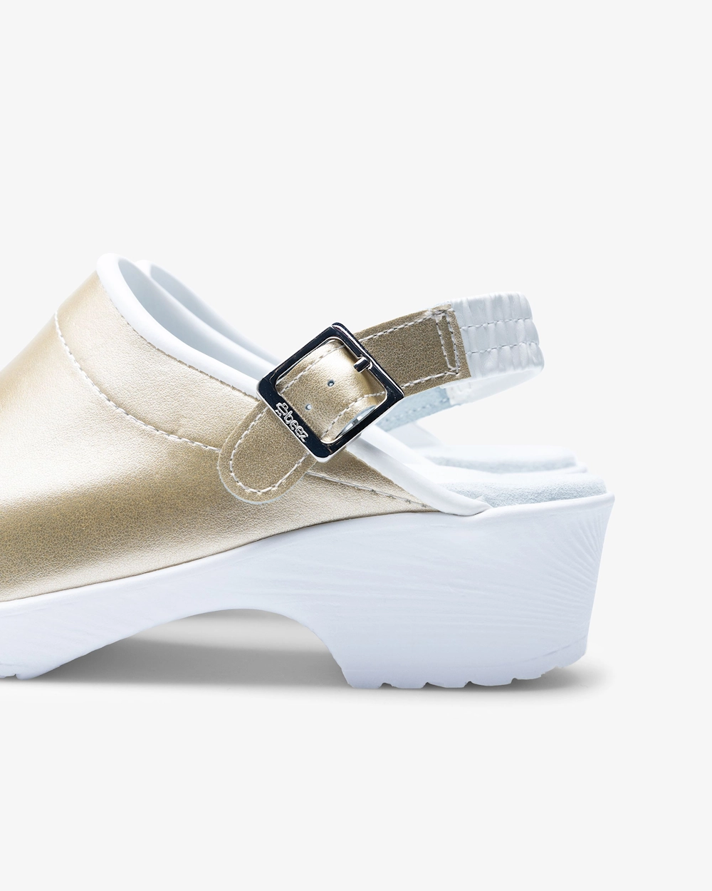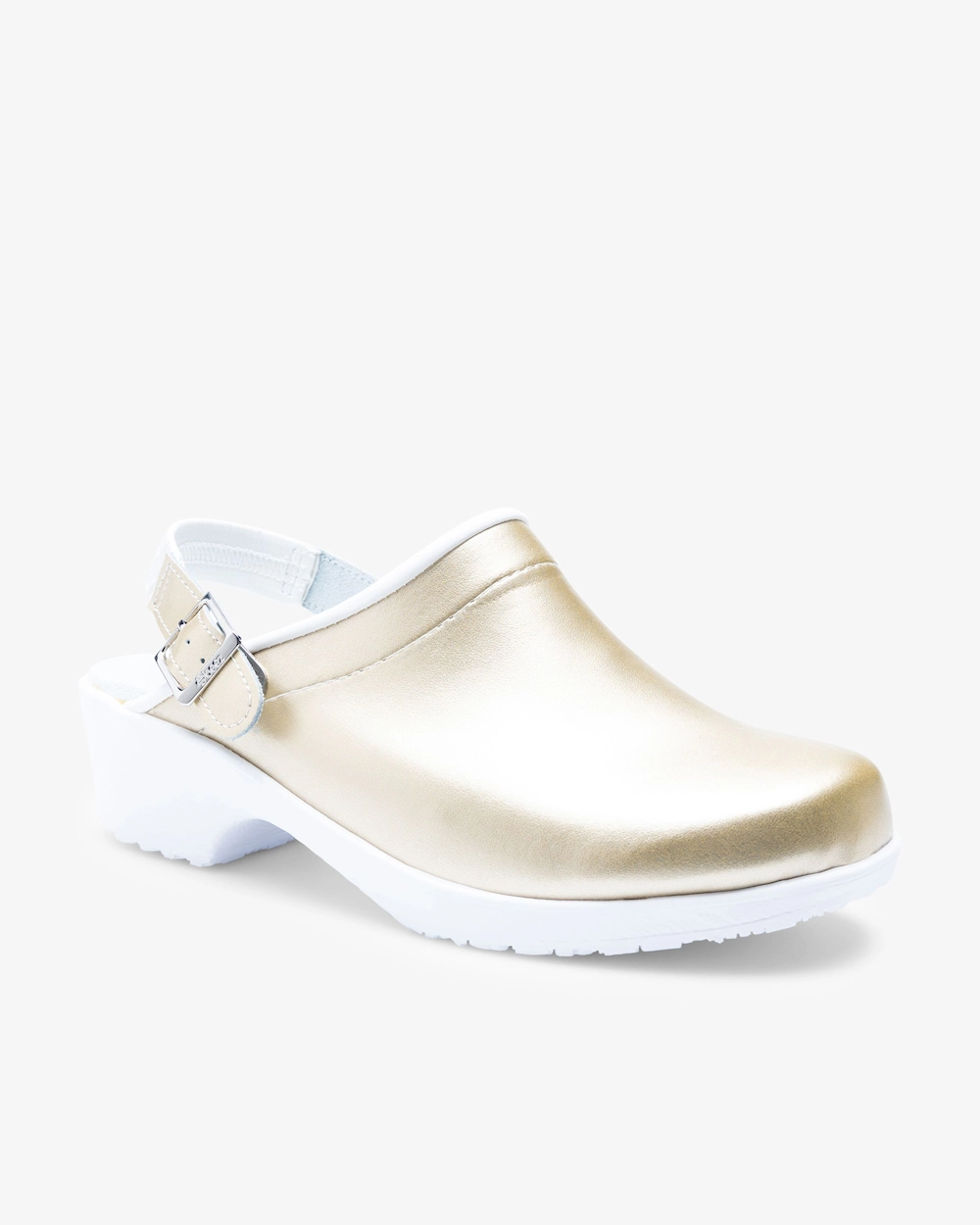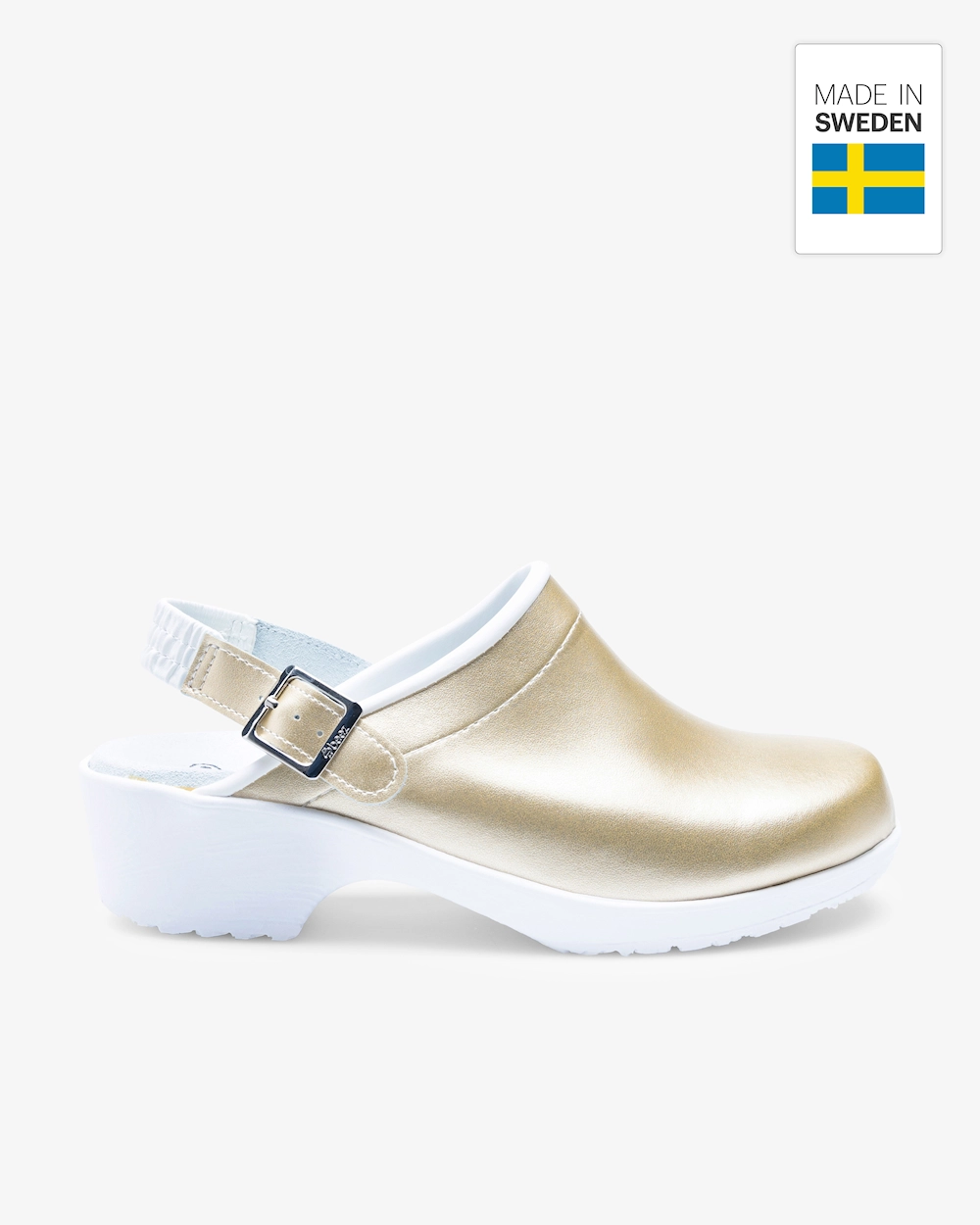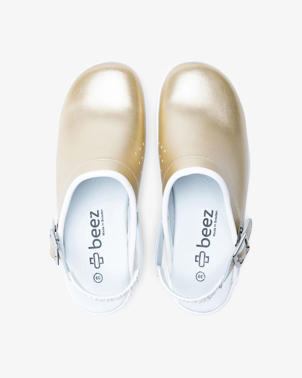 Beez Klassisk Arbejdssko i farven guld er en svenskproduceret sko, specielt udviklet til at opfylde de ergonomiske og hygiejniske krav i sundhedssektoren. Modellen er designet til at give pålidelig komfort og støtte under lange arbejdsdage på hårde gulve.