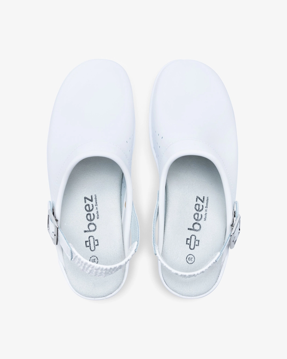 Beez Klassisk Arbejdssko i hvid er en moderne fortolkning af den arketypiske sko for sundhedspersonale. Denne svenskproducerede sko forvalter arven af en ren og professionel æstetik, samtidig med at den er konstrueret med nutidens teknologi for at give maksimal komfort og aflastning under lange, krævende arbejdsvagter.