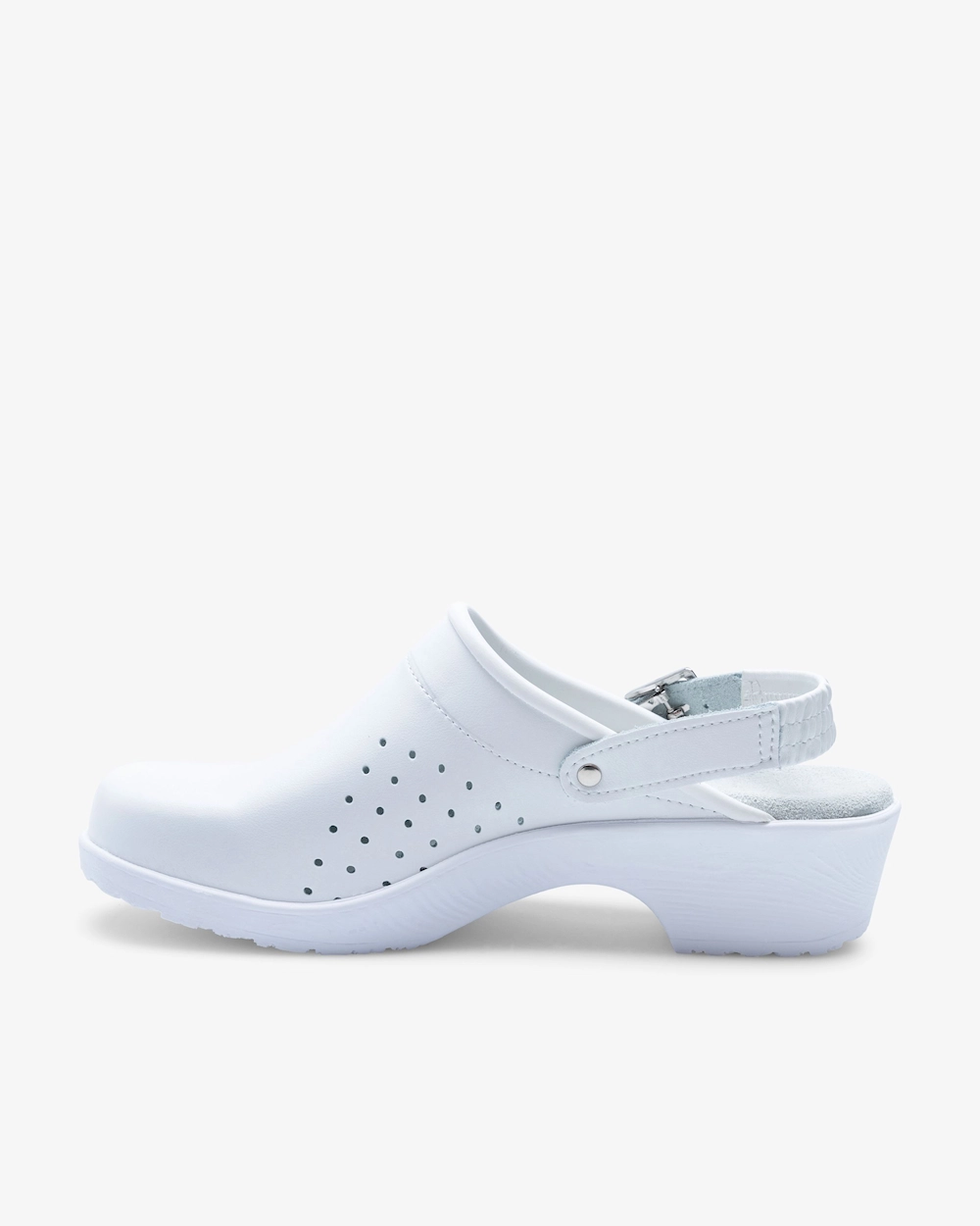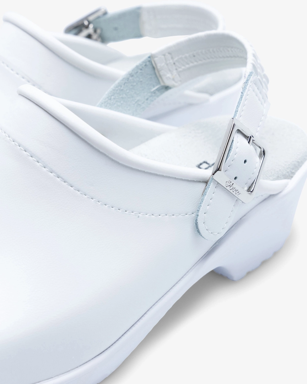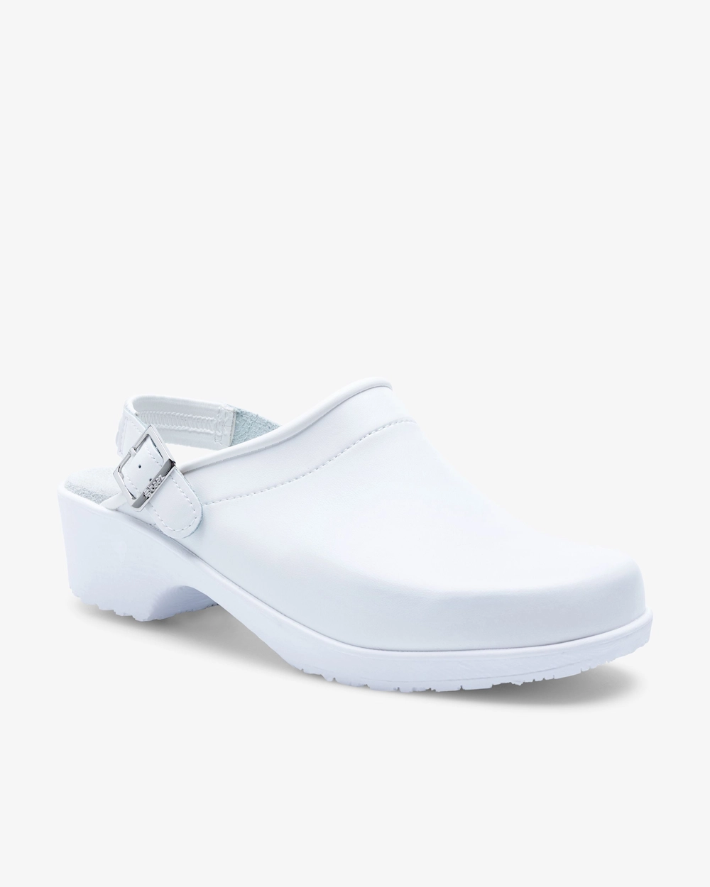 Designet for optimal hygiejne og komfort Overdelen er lavet af smidigt ægte læder, der tilpasser sig fodens form og giver en personlig pasform. For at imødekomme de strenge krav i sundhedsmiljøer er overfladen belagt med et beskyttende og glat lag af PU (polyurethan). Dette gør skoen let at inspicere visuelt, tørre af og holde ren, hvilket er fundamentalt for en høj hygiejnisk standard. Den stødabsorberende polyurethansål er udviklet til at absorbere stød fra hårde gulve og dermed reducere belastningen på kroppens led. For øget alsidighed kan den stabile hælrem roteres fremad for en slip-on-funktion eller bagud for ekstra sikkerhed.