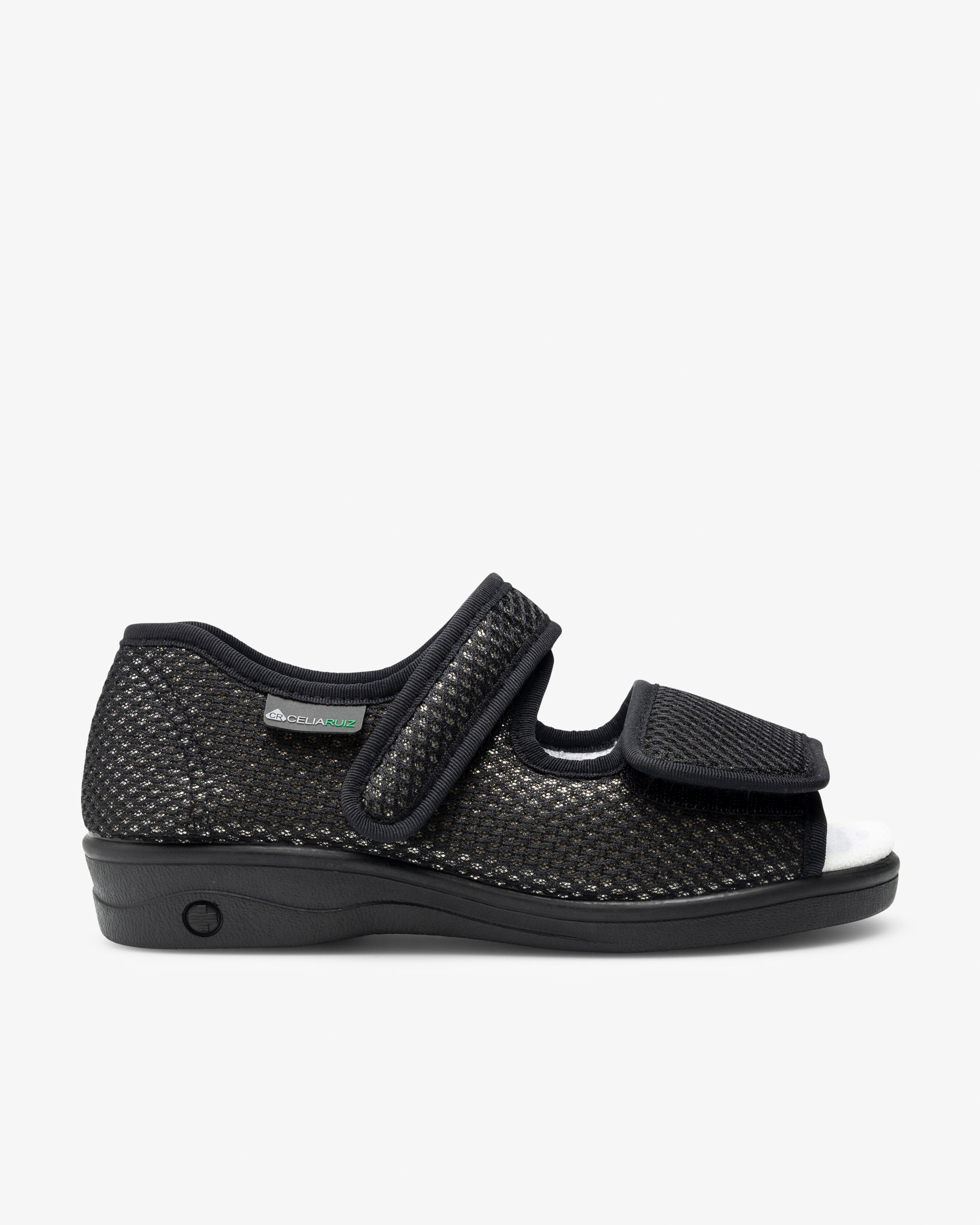 Specialsko med åben tå designet specielt til folk med brede forfødder, som har brug for sko, der er nemme at tage af og på. To remme med velcrolukning giver mulighed for en justerbar pasform. Stabil og skridsikker ydersål i gummi med godt greb i underlaget. Kan vaskes ved maks. 30⁰C - helst i en vaskepose, og bør lufttørres. Denne sko egner sig godt til følsomme fødder.