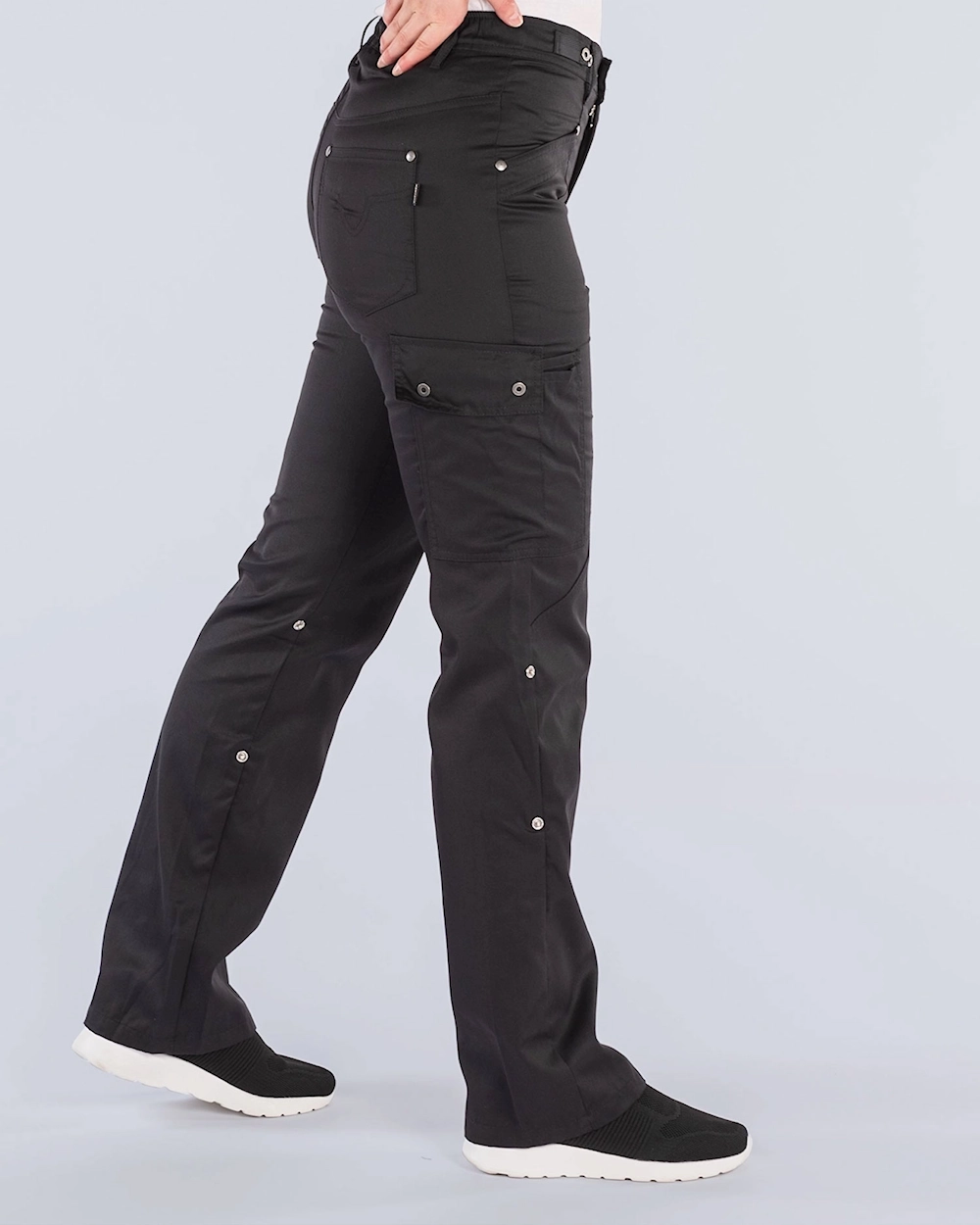 • Justerbar længde i tre niveauer med trykknapper på buksebenene