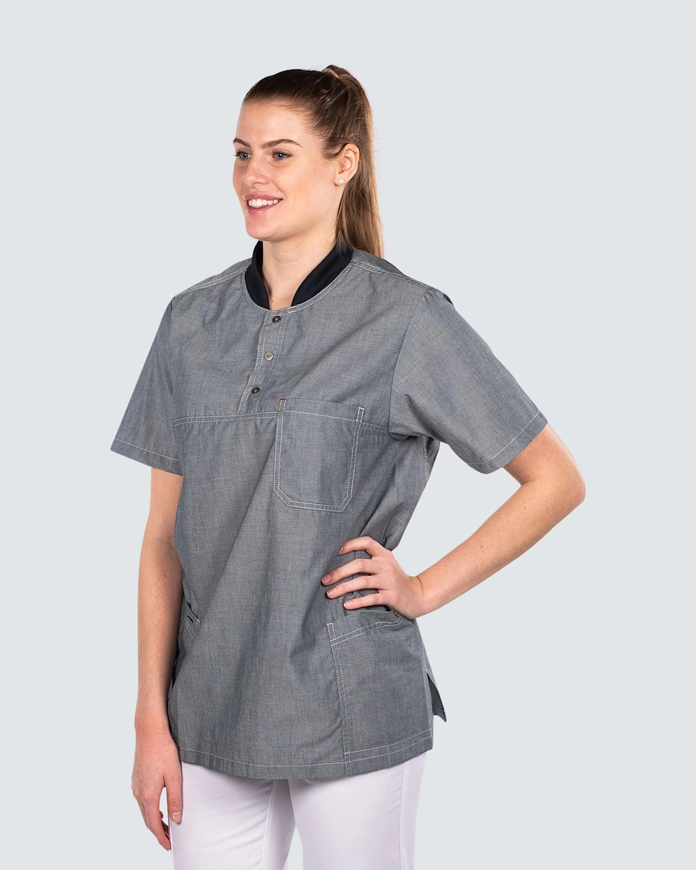 Busseronne i bomuld/polyester stof, der har en let og behagelig fornemmelse. Busseronnen har praktiske lommer, flotte detaljer og en blød krave, der sætter en fin tone.