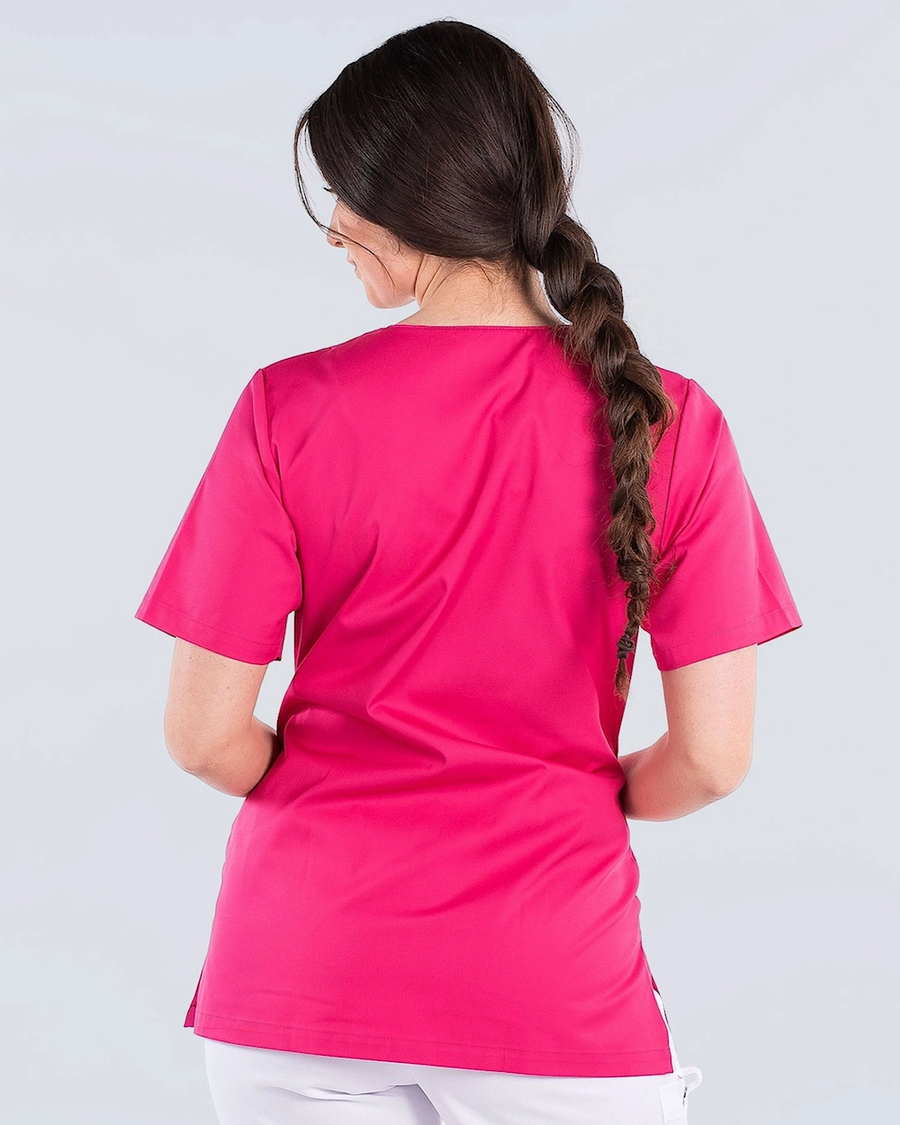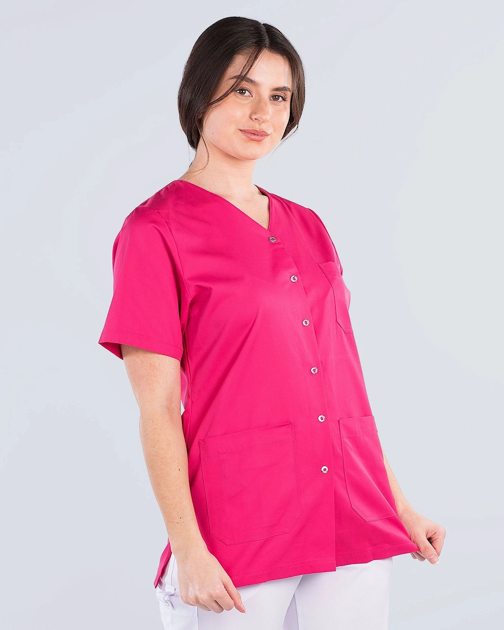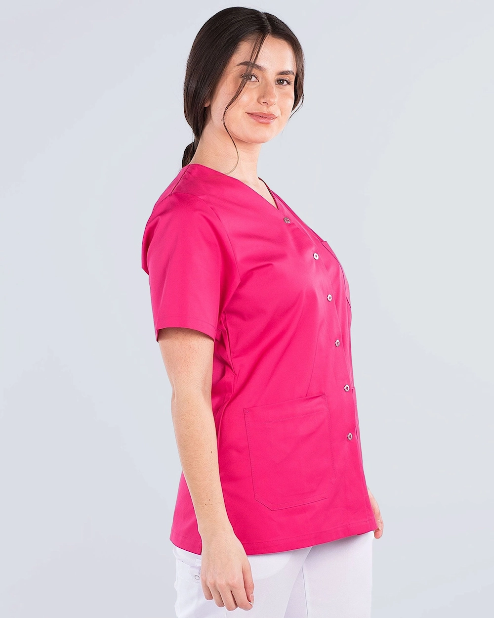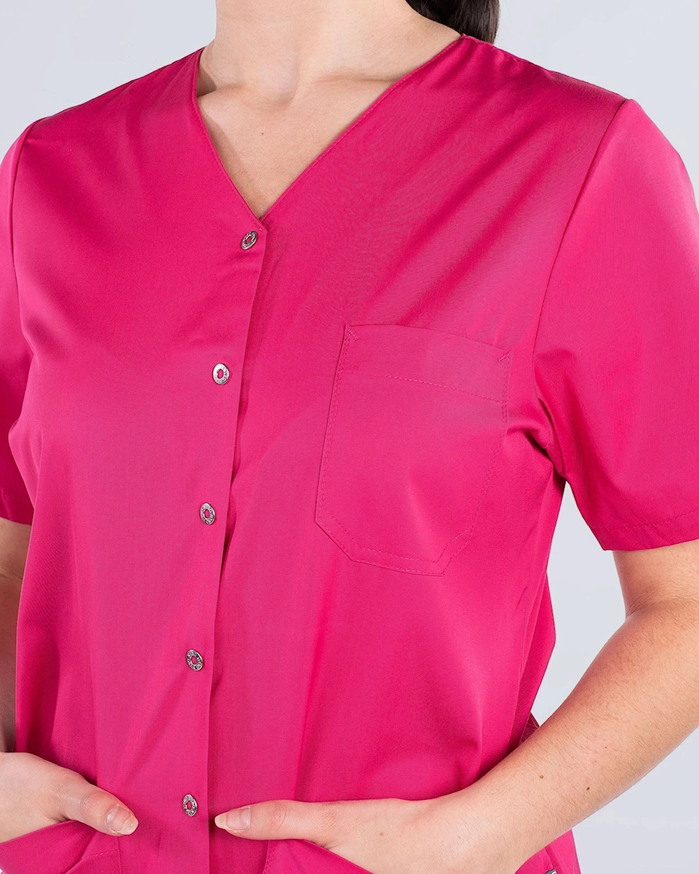 Arbejdstunika med praktiske trykknapper og dekorativ v-udskæring. Tunikaen er let skræddersyet for en god pasform og med slids i siderne får du optimal komfort og bevægelsesfrihed. Rummelig brystlomme og hoftelommer med mobillomme og nøgleholder giver masser af opbevaringsmuligheder.