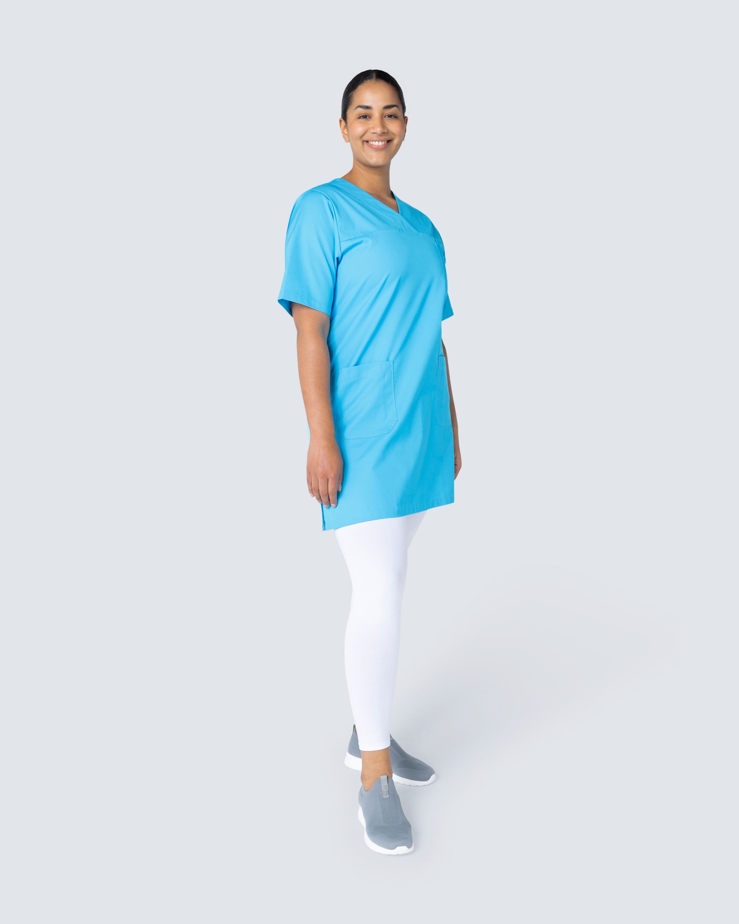 Denne arbejdskjole har v-udskæring og er let figursyet for en god pasform. Kjolen går til lige over knæet og passer godt til både arbejdsbukser eller leggings. Brystlomme og to rummelige hoftelommer med både nøglebånd og mobillomme giver masser af plads til opbevaring.
