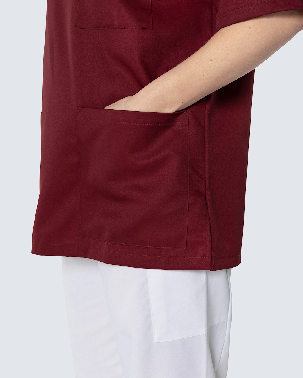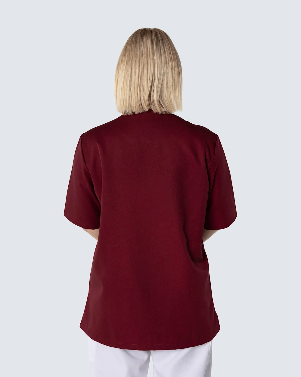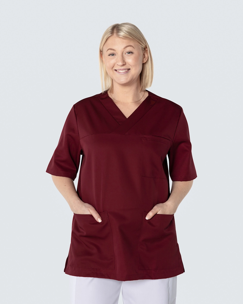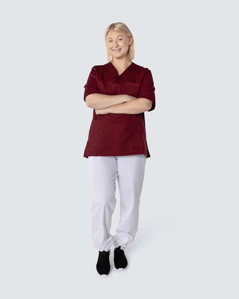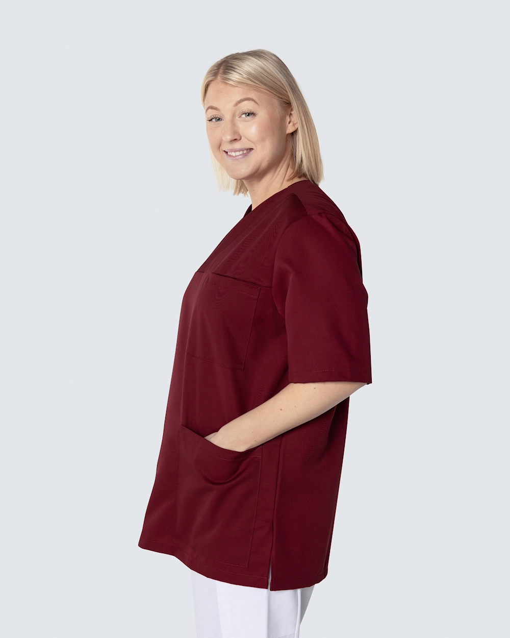 Busseronne i unisex-model designet i en afslappet, rummelig pasform med et sporty look. Denne style har en generøs længde og sideslidser i siderne for maksimal bevægelsesfrihed. Brystlomme og to rummelige hoftelommer, hvoraf den ene har en mindre inderlomme til mobiltelefonen eller småt udstyr. Busseronnen er meget åndbar og lavet af slidstærkt og temperaturregulerende Tencel, - et materiale der føles behageligt mod kroppen.