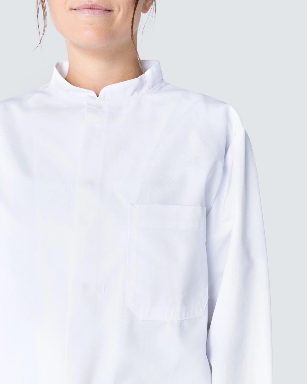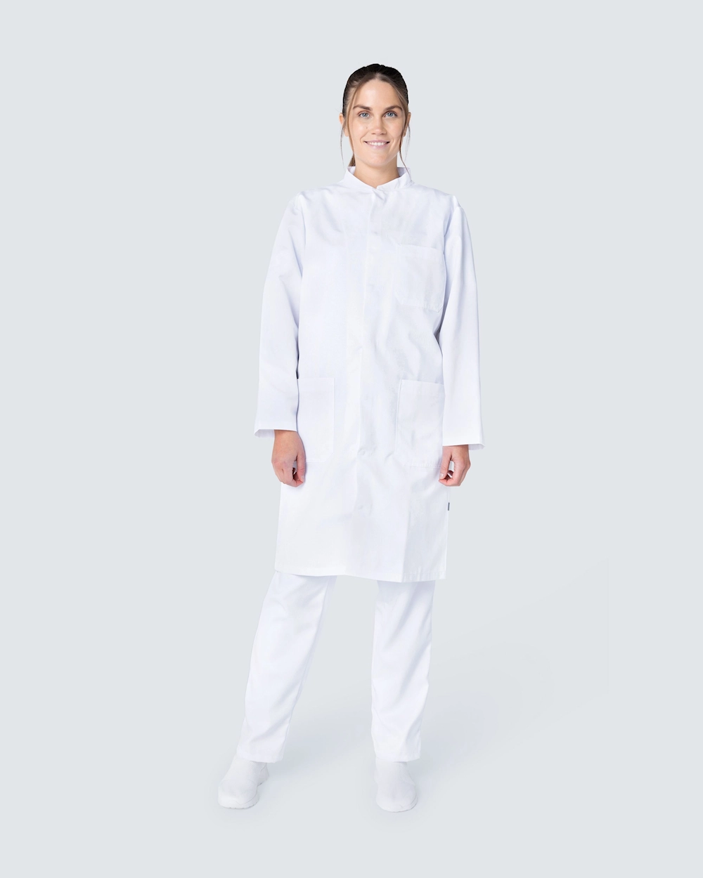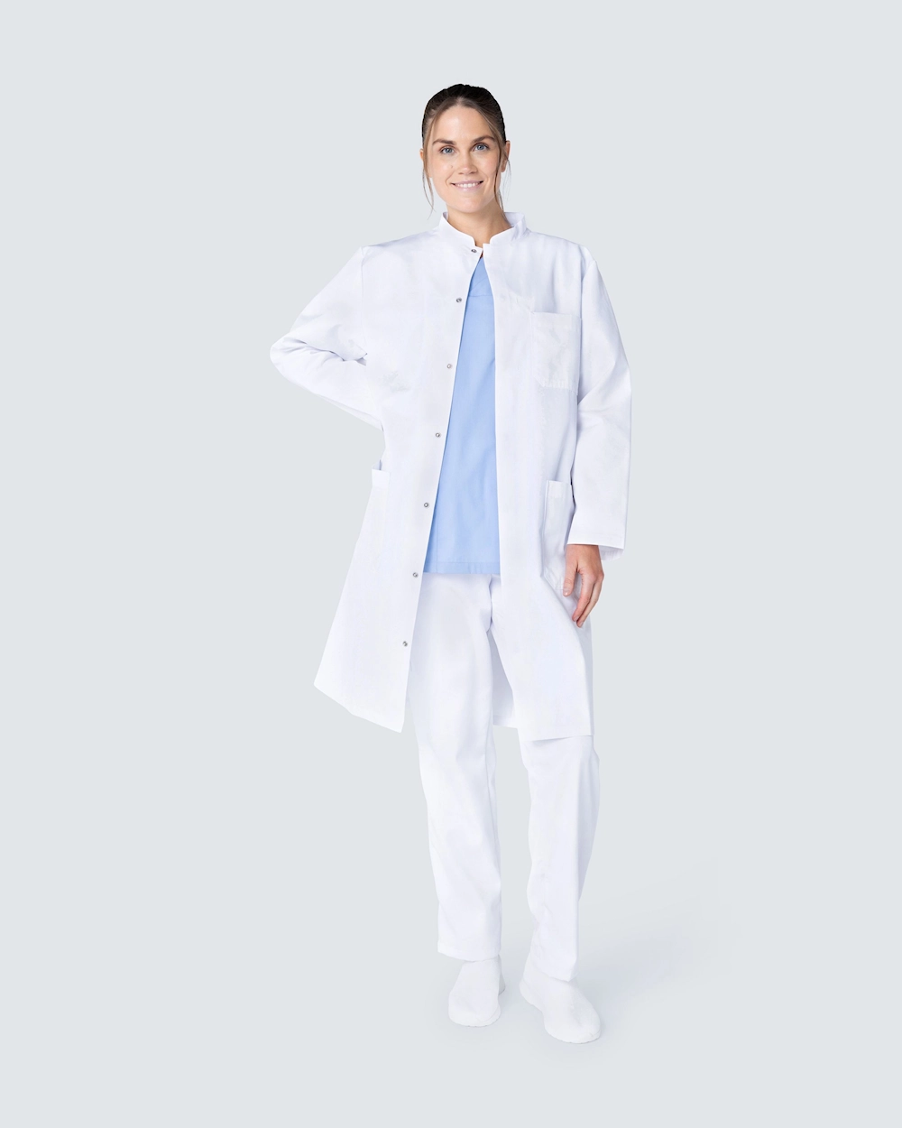Lægekittel i lige unisex model med praktiske og rummelige lommer. Kitlen har en dekorativ ståkrave og en skjult knaplukning.