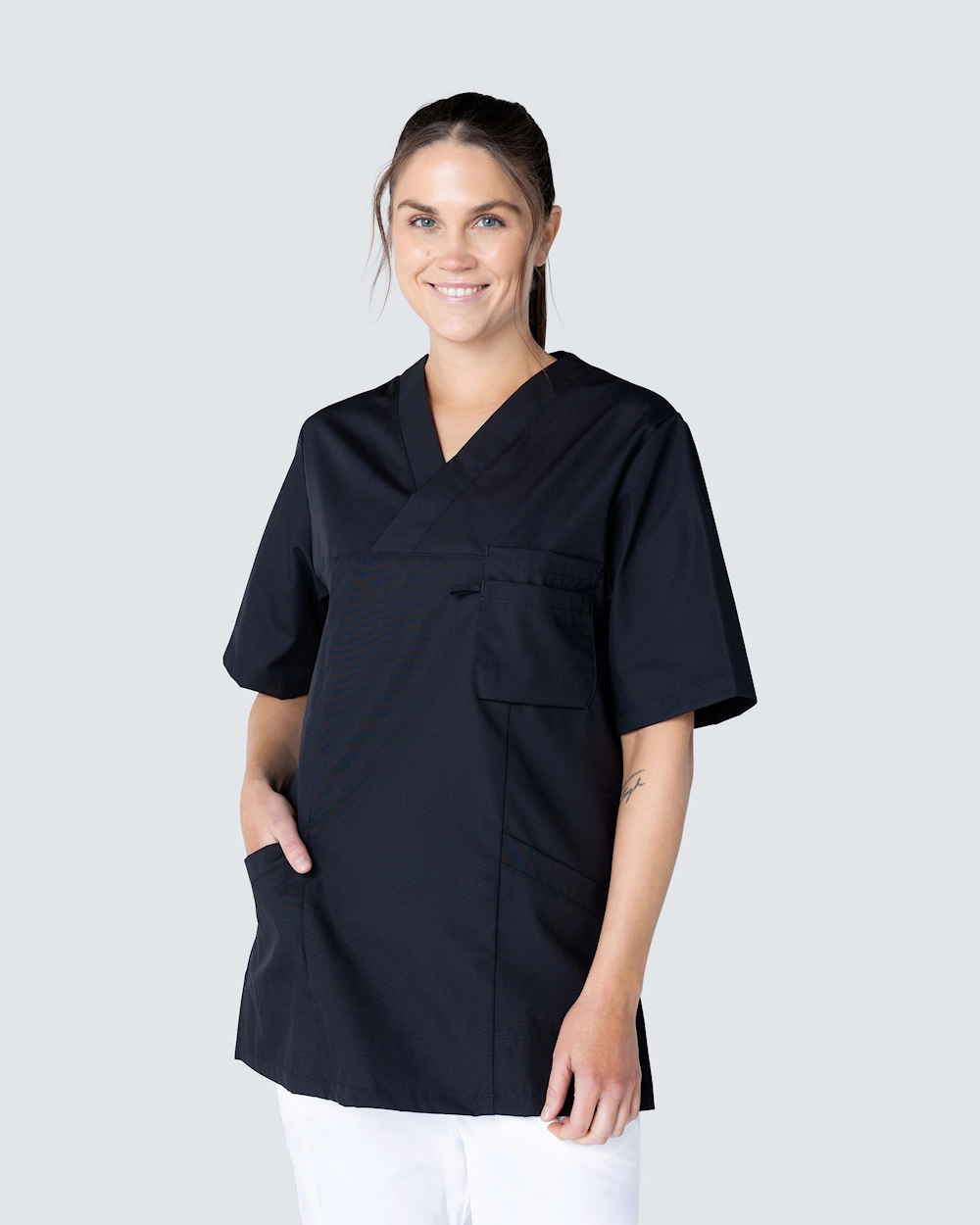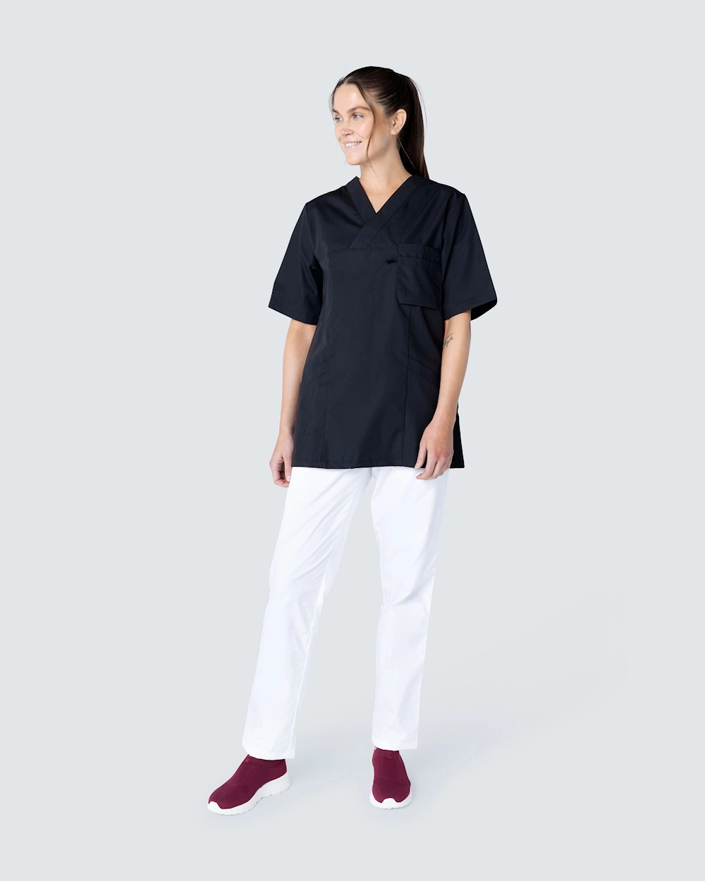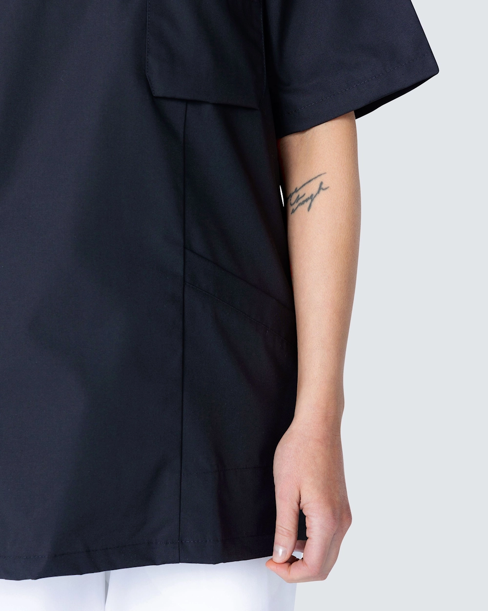 Behagelig og fleksibel V-hals tunika fra Segers, der passer perfekt til både damer og herrer. Tunikaen er udrustet med flere gode funktioner for at lette arbejdet. Domestik tunika har en brystlomme med dobbeltfunktion og to skrå sidelommer med dobbelt stof for øget holdbarhed. I højre lomme finder du også en telefonlomme og nøglering, hvor du nemt kan fastsætte dine nøgler eller ID-kort. Med et slids i siderne får du optimal komfort og bevægelsesfrihed.