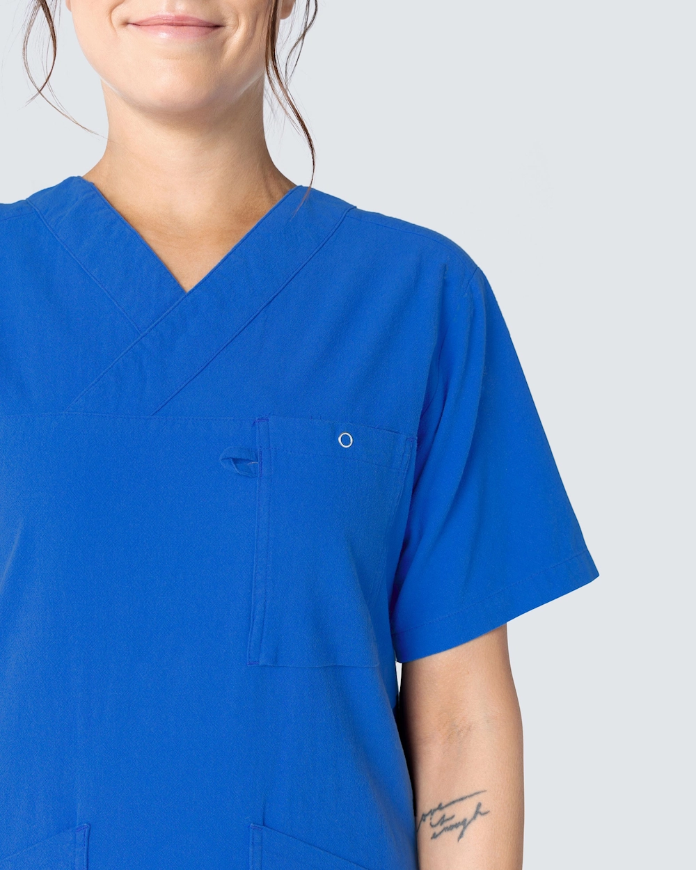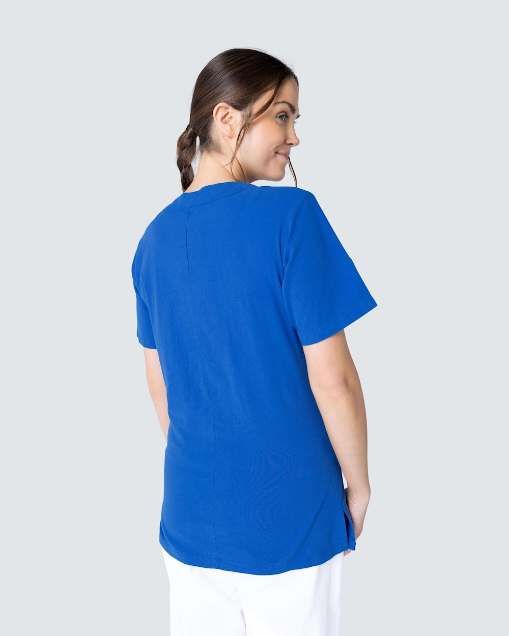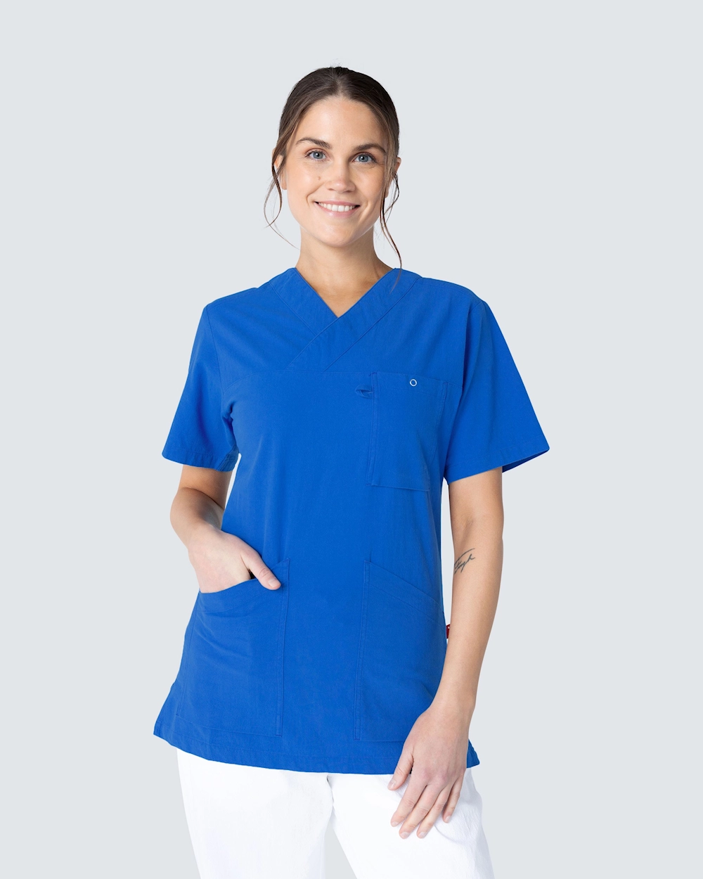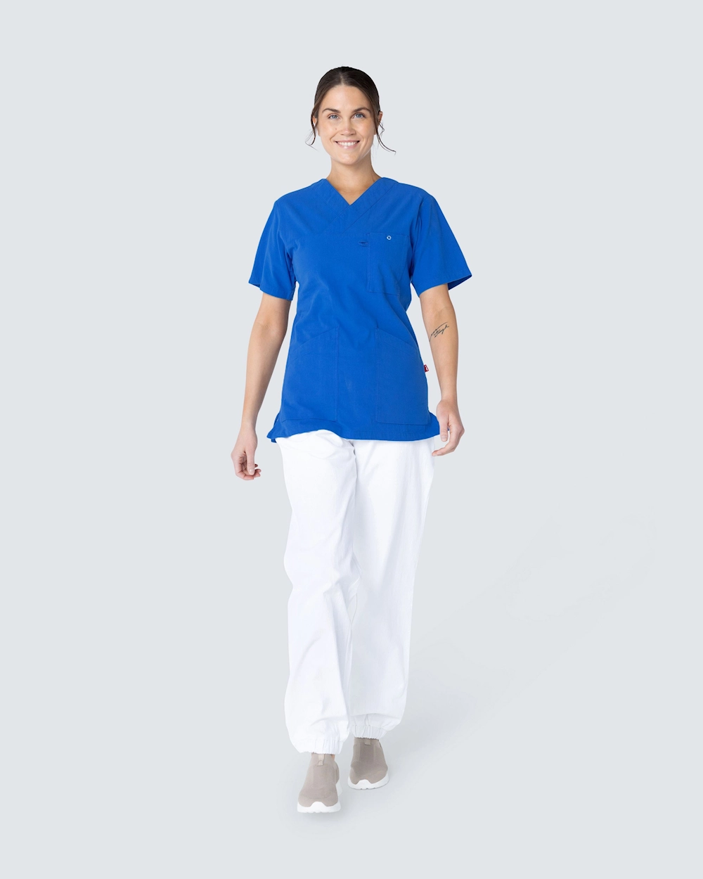 Komfortabel busseronne i krøllet bomuld i en let indsnævret model, der fremhæver dine former. South Wests busseronne i krøllet bomuld har en meget blød komfort, høj åndbarhed og et luftigt design, der giver maksimal bevægelsesfrihed. Busseronnen har en klassisk v-udskæring og figursyet pasform, der giver et meget flot omrids. Med to rummelige sidelommer, hvoraf den ene er udstyret med en nøgleholder og telefonlomme, og en brystlomme med en ringtrykknap, her har du masser af plads til en kuglepenslomme, saks, ID-kort og alle andre værktøjer, der er nødvendige til en dag i plejen.