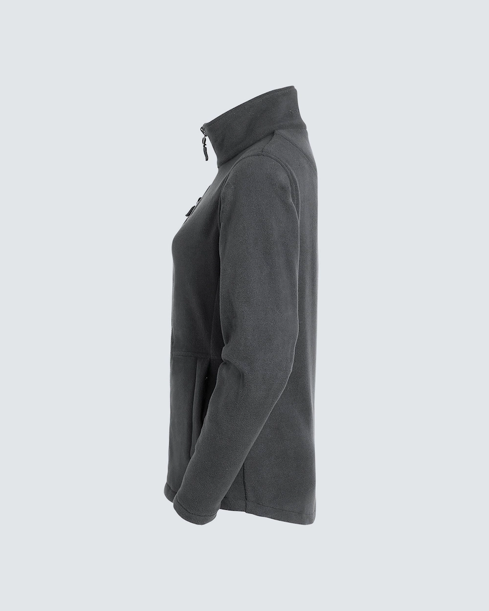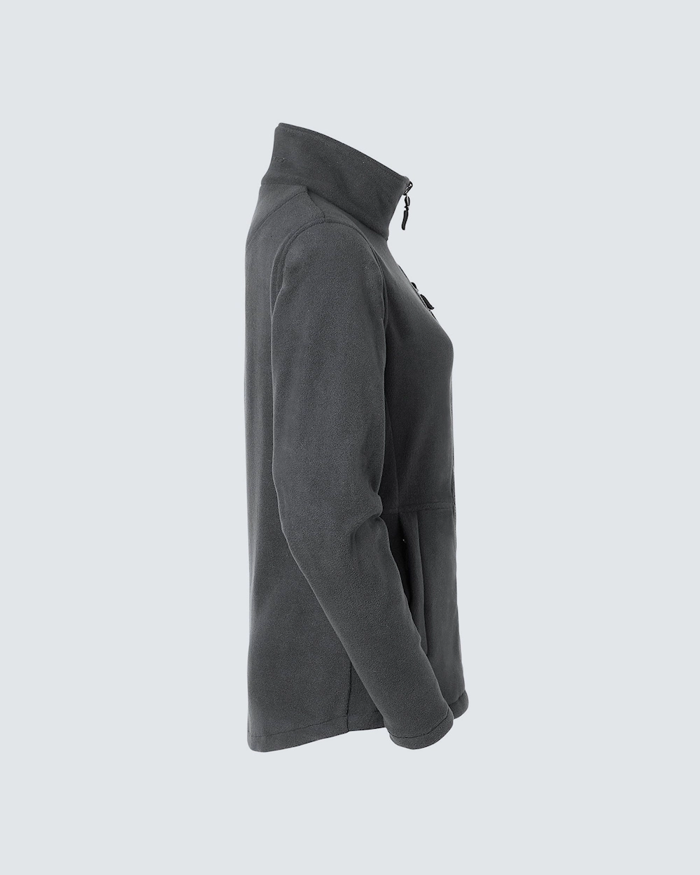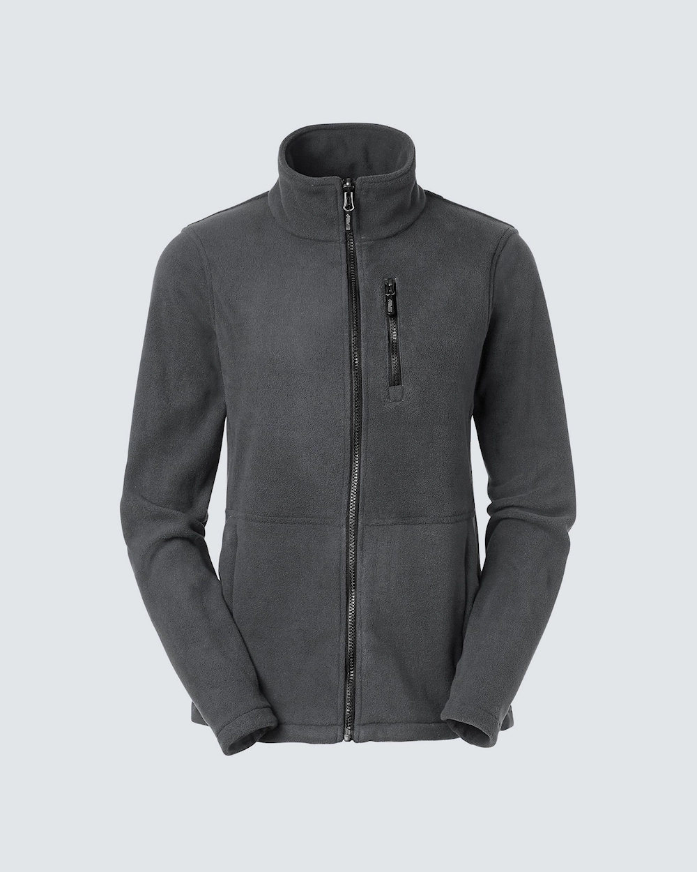 Fleecejakke med kvinde pasform. To sidelommer og en lomme på venstre bryst. Alle lommer har lynlåse i en kontrastfarve. Fleecen leveres med sorte zip-pullers, der kan ændres efter behov.