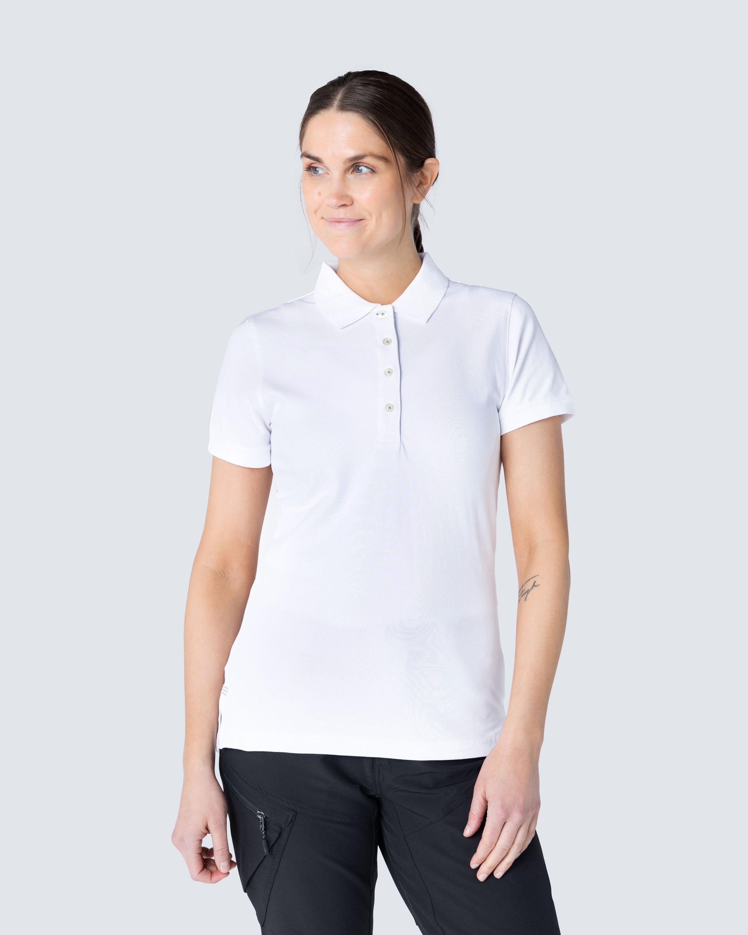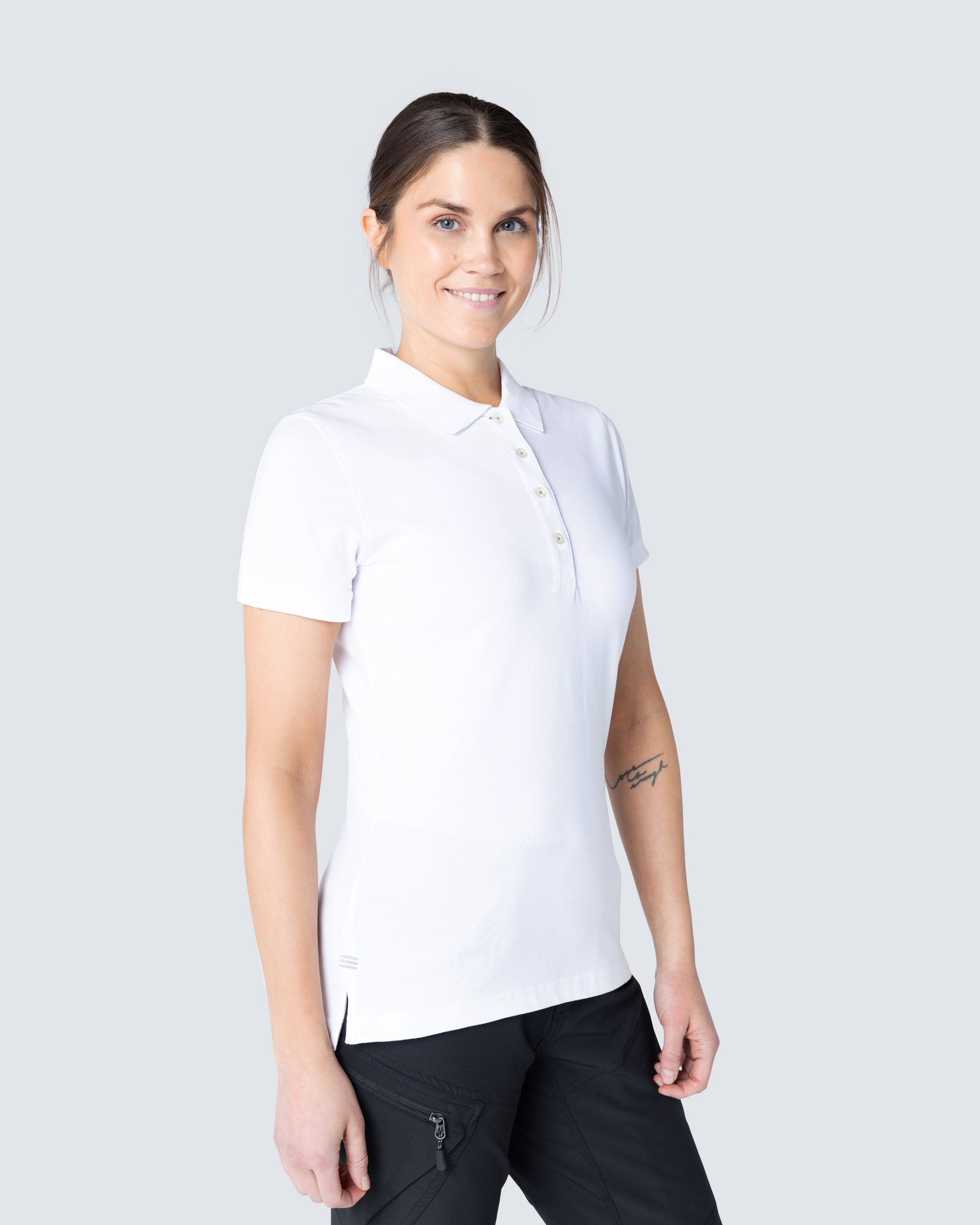 Piké med kvinde pasform. Dekorativt bånd i nakke og slids. Halvmånesøm i nakken. Længere knapslåen for et mere feminint look. Knapslåen har hvide knapper og et sildebensmønsteret inderside i en anden farve samt et diskret broderi, der går tone-til-tone. Broderi i en anden farve over slidsen.